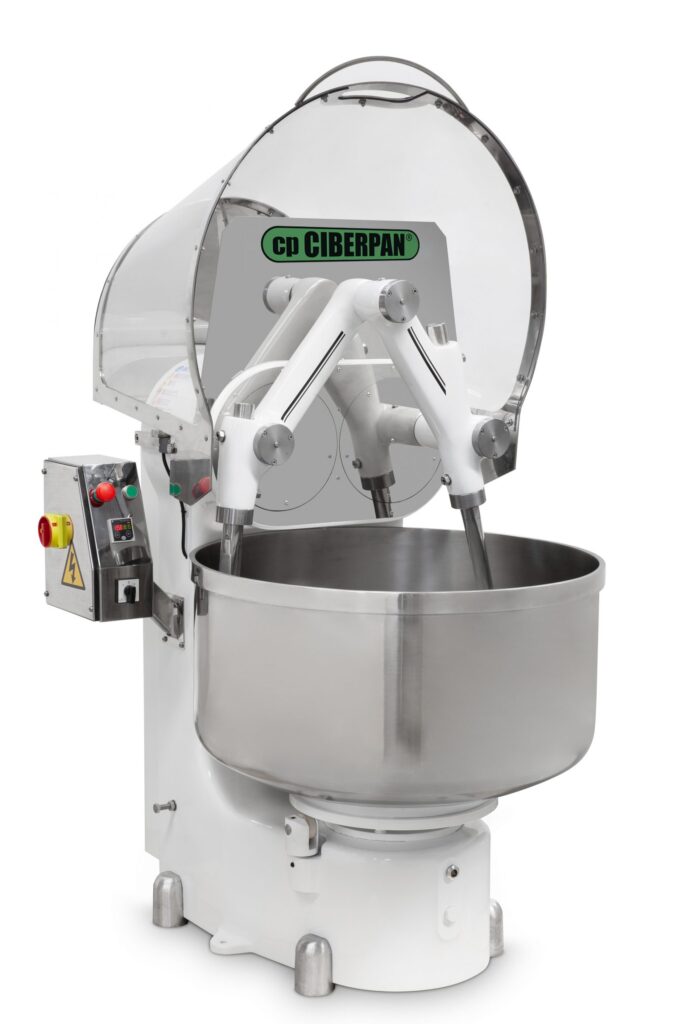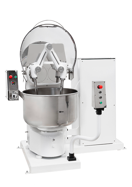 La Amasadora de Brazos con volcador o volquete permite descargar la masa sobre la tolva de la pesadora. Con apretar un botón el volquete sube la amasadora para que la masa caiga dese el perol hasta la tolva de la pesadora.